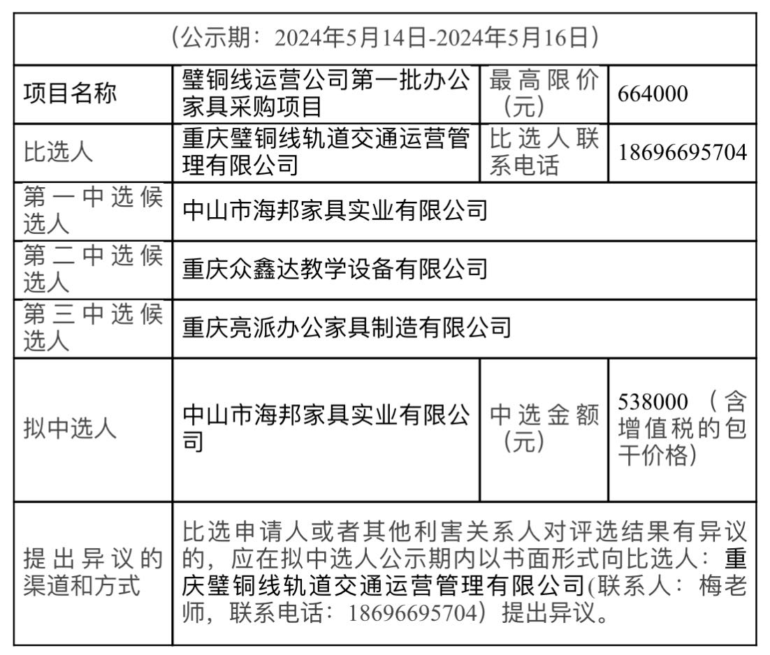 璧銅線運(yùn)營(yíng)公司第一批辦公家具采購項(xiàng)目競(jìng)爭(zhēng)性比選結(jié)果公示表