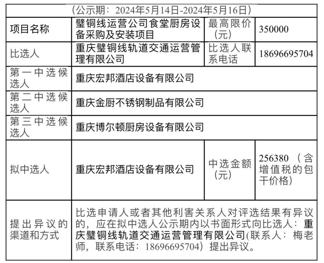 璧銅線運(yùn)營公司廚房設(shè)備采購及安裝項目競爭性比選結(jié)果公示表