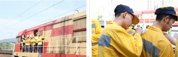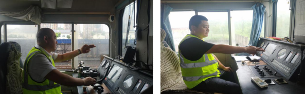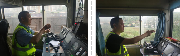 司機吳登倫正在和信號樓進行要道還道            副司機王汶棋正在確認進路和信號