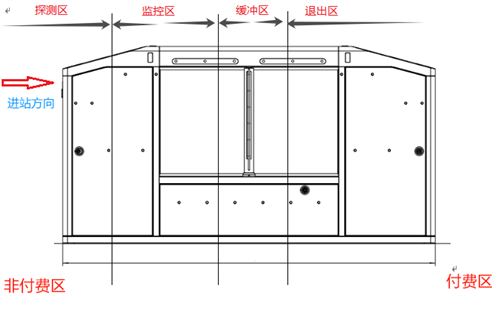 閘機(jī)通道從通行方向分為探測(cè)區(qū)、監(jiān)控區(qū)、緩沖區(qū)、退出區(qū)。